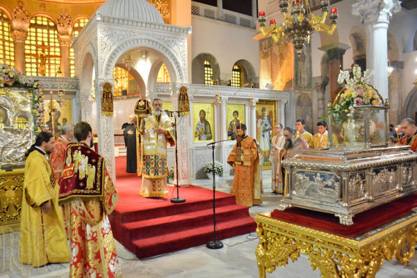 Το εσπέρας στις 6:30 μ.μ. τελείται ο Μέγας Πανηγυρικός Αρχιερατικός Εσπερινός, χοροστατούντος του Σεβ. Μητροπολίτου Ιερισσού, αγίου Όρους και Αρδαμερίου κ. Θεοκλήτου, ενώ τη Δευτέρα 26η Οκτωβρίου από τις 7:00 π.μ. έως τις 11:00 π.μ., θα τελεσθούν ο Όρθρος, το πανηγυρικό πολυαρχιερατικό Συλλείτουργο και εν συνεχεία η Δοξολογία για την επέτειο της απελευθερώσεως της πόλεως, προεξάρχοντος του Παναγιωτάτου Μητροπολίτου Θεσσαλονίκης κ. Ανθίμου.