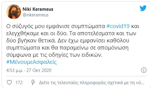 Με ανάρτηση της στα Μέσα Κοινωνικής Δικτύωσης, η υπουργός Παιδείας και Θρησκευμάτων ανακοίνωσε ότι είναι θετική στον κορωνοϊό χωρίς να έχει εμφανίσει συμπτώματα, ενώ θετικός με συμπτώματα είναι και ο σύζυγός της.
