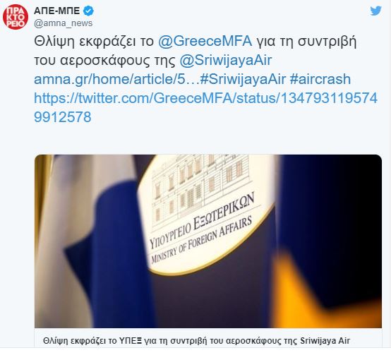 Τη θλίψη του εκφράζει το υπουργείο Εξωτερικών για τη συντριβή του αεροσκάφους της Sriwijaya Air κοντά στην Τζακάρτα, με ανάρτησή του στο twitter.