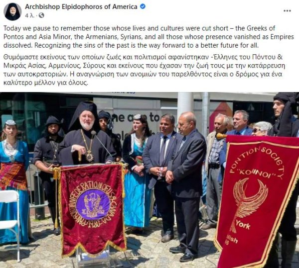 “Θυμόμαστε εκείνους των οποίων ζωές και πολιτισμοί αφανίστηκαν – Έλληνες του Πόντου & Μικράς Ασίας, Αρμενίους, Σύρους και εκείνους που έχασαν την ζωή τους με την κατάρρευση των αυτοκρατοριών. Η αναγνώριση των ανομιών του παρελθόντος είναι ο δρόμος για ένα καλύτερο μέλλον για όλους” αναφέρει ο Σεβασμιώτατος Αρχιεπίσκοπος Αμερικής κ. Ελπιδοφόρος σε επίκαιρη ανάρτησή του.