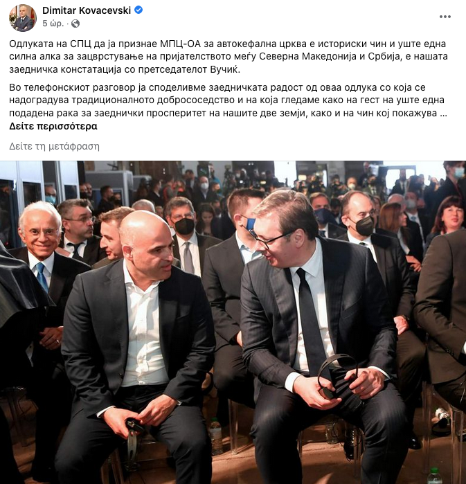 Τηλεφωνική επικοινωνία είχαν ο Πρωθυπουργός των Σκοπίων Ντίμιταρ Κοβάτσεφσκι και ο Πρόεδρος της Σερβίας Αλεξάνταρ Βούτσιτς με αφορμή την αναγνώριση της αυτοκεφαλίας της Αρχιεπισκοπής Αχρίδος από την Ιερά Σύνοδο των Επισκόπων του Πατριαρχείου Σερβίας, όπως αναφέρει ο Πρωθυπουργός Κοβάτσεφσκι με μήνυμα του σε μέσο κοινωνικής δικτύωσης.