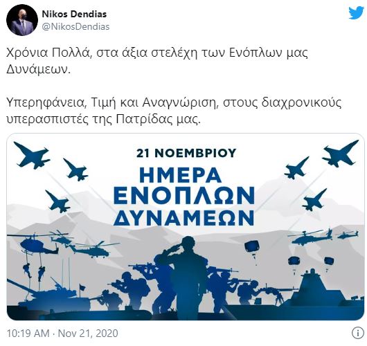 Μήνυμα για την Ημέρα εορτασμού των Ενόπλων Δυνάμεων έστειλε ο υπουργός Εξωτερικών της Ελλάδος κ. Νίκος Δένδιας με ανάρτησή του στο twitter. “Χρόνια Πολλά, στα άξια στελέχη των Ενόπλων μας Δυνάμεων. Υπερηφάνεια, Τιμή και Αναγνώριση, στους διαχρονικούς υπερασπιστές της Πατρίδας μας» ανέφερε ο κ. Δένδιας.