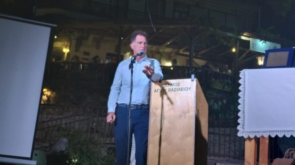 Την εκδήλωση που έγινε στο Σπήλι, την Κυριακή, 6 Αυγούστου 2023, στις 8 μ.μ., στη μαγευτική κεντρική πλατεία, μετά το καλωσόρισμα των δύο δημάρχων, χαιρέτισαν ο Υφυπουργός Τουρισμού της Κύπρου, κ. Κώστας Κουμής, ο ευρωβουλευτής κ. Νίκος Παπανδρέου και ο δημοσιογράφος και συγγραφέας κ. Κώστας Σερέζης.