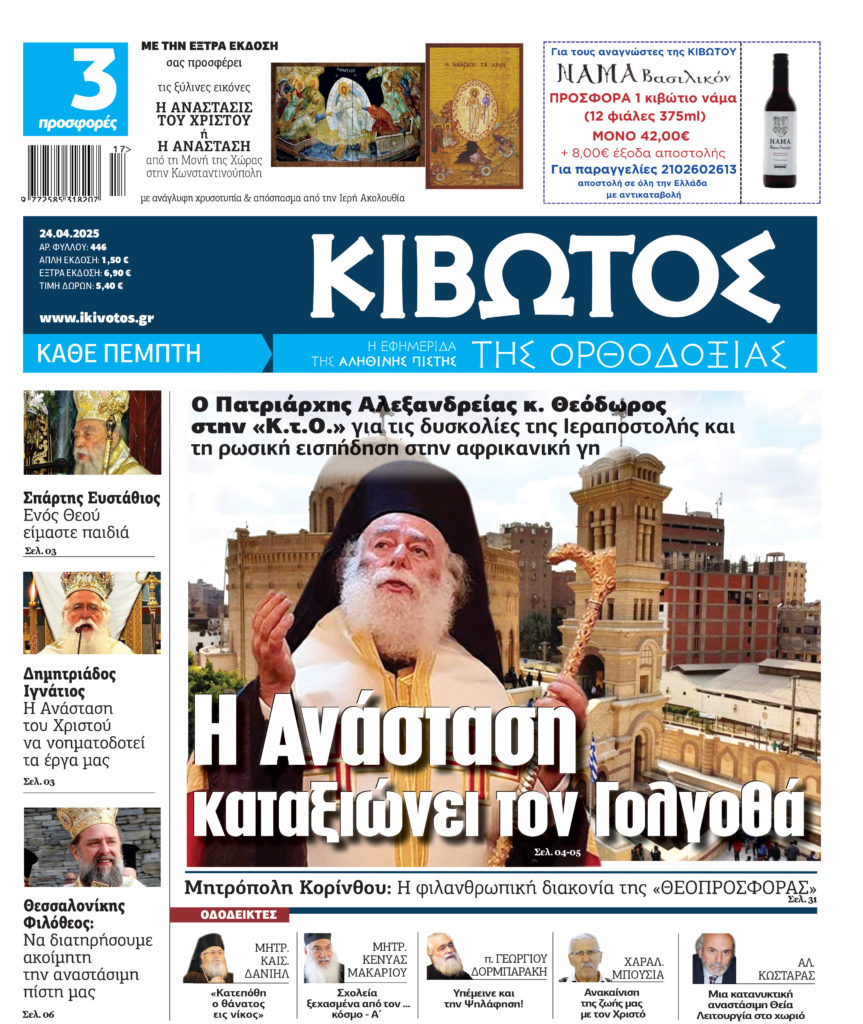 Την Πέμπτη, 24 Απριλίου, κυκλοφορεί το νέο φύλλο της Εφημερίδας «Κιβωτός της Ορθοδοξίας»