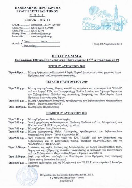 ΠΑΝΕΛΛΗΝΙΟ ΙΕΡΟ ΙΔΡΥΜΑ ΕΥΑΓΓΕΛΙΣΤΡΙΑΣ ΤΗΝΟΥ – ΠΡΟΓΡΑΜΜΑ ΕΟΡΤΑΣΜΟΥ ΕΘΝΙΚΟΘΡΗΣΚΕΥΤΙΚΗΣ ΠΑΝΗΓΥΡΕΩΣ 15ης ΑΥΓΟΥΣΤΟΥ 2019.