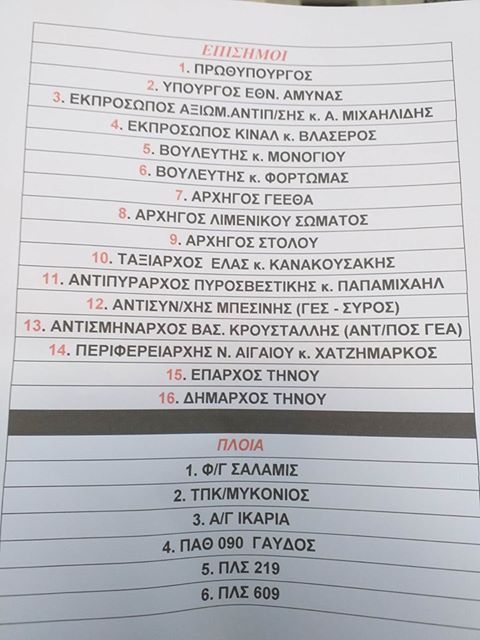 Ανάμεσα στις εκδηλώσεις για την Μεγαλόχαρη, ο πρωθυπουργός, ο αρχηγός του Ναυτικού και άλλοι επίσημοι επιβαίνουν σε τορπιλάκατο του Πολεμικού Ναυτικού απ’ όπου πετούν στεφάνια στα κυκλαδίτικα νερά τιμώντας την επέτειο της βύθισης του αντιτορπιλικού «Έλλη» το δεκαπενταύγουστο του 1940.