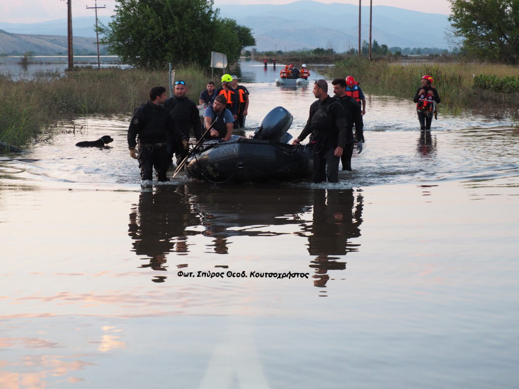 Ένας σκύλος στην άκρη της φωτογραφίας, με ” έκπληξη παρακολουθεί “, ότι στον δρόμο που οδηγεί στο χωριό Μεταμόρφωση Καρδίτσας από τον Παλαμά, αντί να περνούν αυτοκίνητα το Σάββατο 9/9/2023, περνούσαν βάρκες διασωστών, που μετέφεραν ανθρώπους και κατοικίδια που είχαν εγκλωβιστεί,
