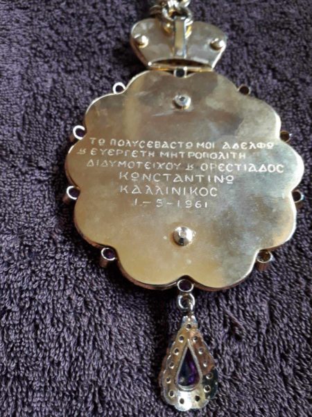 ”ΤΩ ΠΟΛΥΣΕΒΑΣΤΩ ΜΟΙ ΑΔΕΛΦΟ ΕΥΕΡΓΕΤΗ ΜΗΤΡΟΠΟΛΙΤΗ ΔΙΔΥΜΟΤΕΙΧΟΥ ΚΑΙ ΟΡΕΣΤΙΑΔΟΣ ΚΩΝΣΤΑΝΤΙΝΩ. ΚΑΛΛΙΝΙΚΟΣ 1-5-1961″ γράφει το αφιέρωμα του Αγίου στην πίσω πλευρά του εγκολπίου. Το δώρο αυτό προσέφερε ο Άγιος Καλλίνικος στον κατά σάρκα μεγαλύτερο αδελφό του και ευεργέτη του όταν ήταν Πρωτοσύγκελος της Ιεράς Μητροπόλεως Αιτωλίας και Ακαρνανίας.