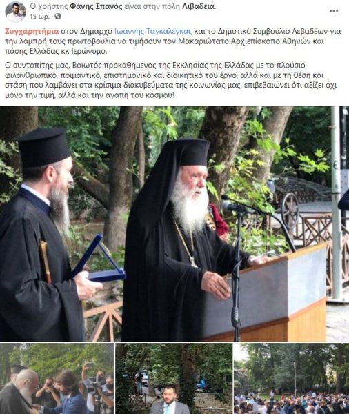 Σε ανάρτησή του στον προσωπικό του λογαριασμό στο Facebook, ο Περιφερειάρχης Στερεάς Ελλάδας Φάνης Σπανός, συνεχάρη τον Δήμαρχο Λειβαδιάς Ιωάννη Ταγκαλέγκα και το Δημοτικό Συμβούλιο Λεβαδέων για την πρωτοβουλία τους να βραβεύσουν τον Μακαριώτατο Αρχιεπίσκοπο Αθηνών και πάσης Ελλάδος κ.κ. Ιερώνυμο, τιμώντας τον με το Χρυσό Κλειδί της πόλης.