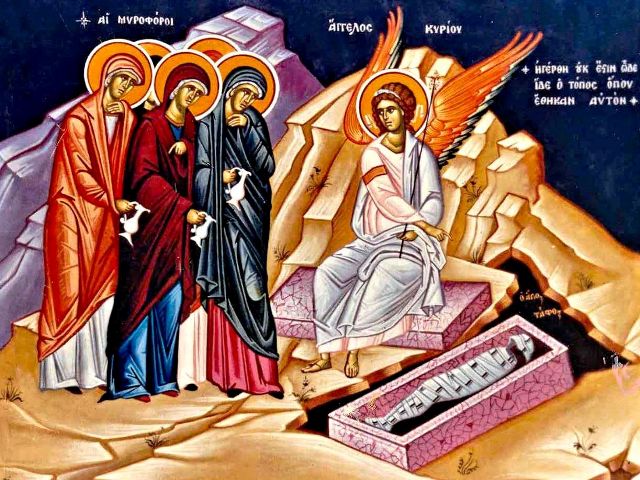 Οι Μυροφόρες αυτές γυναίκες πήγαν στον Τάφο του Ιησού για να εκτελέσουν τα νεκρικά καθήκοντα που έκαναν στο σώμα του νεκρού την εποχή εκείνη και που ήταν η άλειψη του νεκρού σώματος με μύρα. Καθ’ οδόν προς το μνημείο τις απασχολούσε ένα σημαντικό ερώτημα. Ποιός θα μετακινούσε τη μεγάλη πέτρα από την είσοδο του μνήματος που είχαν τοποθετήσει ο Ιωσήφ και ο Νικόδημος. Φτάνοντας στο σημείο του Τάφου διαπίστωσαν ότι η μεγάλη αυτή πέτρα είχε μετακινηθεί από τον τόπο της. Η μετακίνηση της πέτρας γίνεται με την παρέμβαση και την ενέργεια του Θεού για να φανεί ότι παύει πλέον ο Άδης να κατέχει τους νεκρούς.