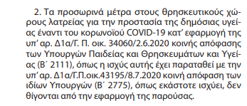 Στο ΦΕΚ διευκρινίζεται επίσης, ότι τα προσωρινά μέτρα στους θρησκευτικούς χώρους λατρείας για την προστασία της δημόσιας υγείας έναντι του κορωνοϊού COVID-19 (σ.σ. αποστάσεις, ανώτατος αριθμός ατόμων σε κάθε ναό, υγειονομικοί κανόνες κ.τ.λ.) τα οποία προβλέπονται από την Κοινή Απόφαση των Υπουργών Παιδείας και Θρησκευμάτων και Υγείας δεν