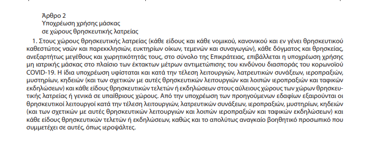 Ειδικότερα για τους χώρους θρησκευτικής λατρείας (κάθε είδους και κάθε νομικού, κανονικού και εν γένει θρησκευτικού καθεστώτος ναών και παρεκκλησιών, ευκτηρίων οίκων, τεμενών και συναγωγών), κάθε δόγματος και θρησκείας, ανεξαρτήτως μεγέθους και χωρητικότητάς τους, στο σύνολο της Επικράτειας, επιβάλλεται η υποχρέωση χρήσης μη ιατρικής μάσκας στο πλαίσιο των έκτακτων μέτρων αντιμετώπισης του κινδύνου διασποράς του κορωνοϊού COVID-19.
