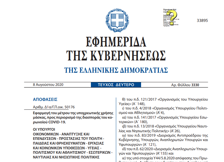 Στο ΦΕΚ τονίζεται ότι είναι υποχρεωτική η χρήση μάσκας στους δημόσιους εσωτερικούς και εξωτερικούς χώρους όλων των επιβατηγών και επιβατηγών-οχηματαγωγών πλοίων, των ημερόπλοιων, των θαλασσίων ταξί και των λαντζών. Στα πλοία και σκάφη του πρώτου εδαφίου απαγορεύεται η οργάνωση και πραγματοποίηση εκδηλώσεων διασκέδασης.