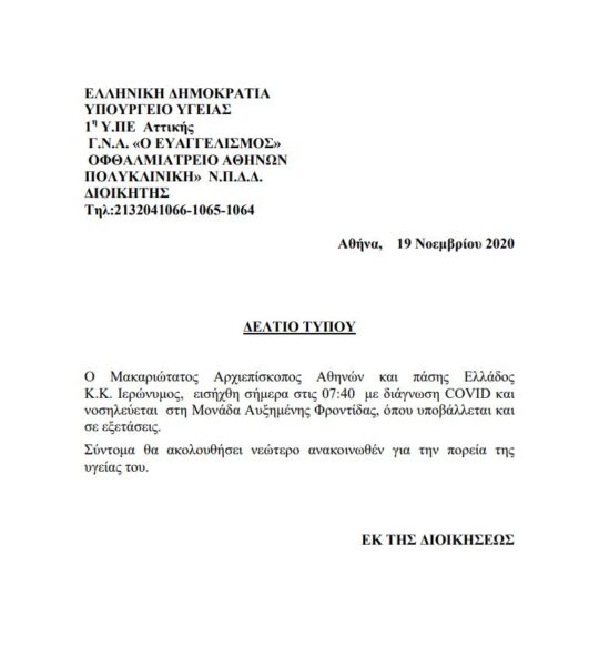 “Ο Μακαριώτατος Αρχιεπισκοπος Αθηνών και πάσης Ελλάδος κ.κ. Ιερώνυμος, εισήχθη σήμερα στις 07:40 με διάγνωση COVID και νοσηλεύεται στη Μονάδα Αυξημένης Φροντίδας, όπου υποβάλλεται και σε εξετάσεις. Σύντομα θα ακολουθήσει ανακοινωθέν για την πορεία της υγείας του”.