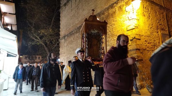 Μετά το πέρας του εσπερινού έγινε η λιτάνευση της Ιερής Εικόνας παιανιζούσης της Δημοτικής Φιλαρμονικής Ναυπλίου.