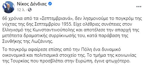 “66 χρόνια από τα «Σεπτεμβριανά», δεν λησμονούμε το πογκρόμ της νύχτας της 6ης Σεπτεμβρίου 1955. Είχε ολέθριες συνέπειες στον Ελληνισμό της Κωνσταντινούπολης και αποτέλεσε την απαρχή της μετέπειτα δραματικής συρρίκνωσής του, κατά παράβαση της Συνθήκης της Λωζάννης. Το πογκρόμ αφαίρεσε επίσης από την Πόλη ένα δυναμικό οικονομικά και πολιτισμικά στοιχείο της. Tο τμήμα της κοινωνίας της Τουρκίας που προσβλέπει στην Ευρώπη, έγινε φτωχότερο”, γράφει.