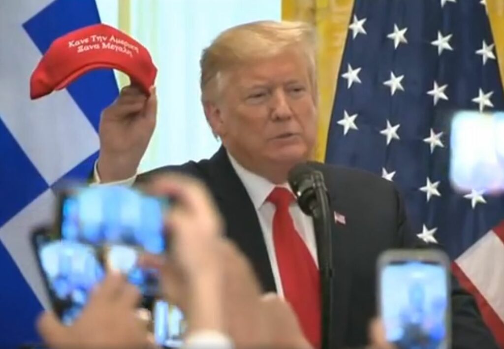Αίσθηση προκάλεσε η κίνηση του Αμερικανού Προέδρου, να παρουσιάσει στους παρευρισκόμενους ένα κόκκινο καπελάκι που έγραφε στα ελληνικά: “Κάντε την Αμερική μεγάλη ξανά”.