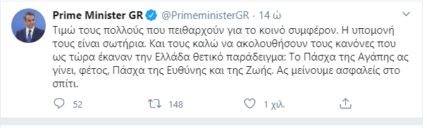 “Τιμώ τους πολλούς που πειθαρχούν για το κοινό συμφέρον. Η υπομονή τους είναι σωτήρια. Και τους καλώ να ακολουθήσουν τους κανόνες που ως τώρα έκαναν την Ελλάδα θετικό παράδειγμα: Το Πάσχα της Aγάπης ας γίνει, φέτος, Πάσχα της Eυθύνης και της Zωής. Ας μείνουμε ασφαλείς στο σπίτι” αναφέρει σε μήνυμά του ο Πρωθυπουργός κ. Κυριάκος Μητσοτάκης.