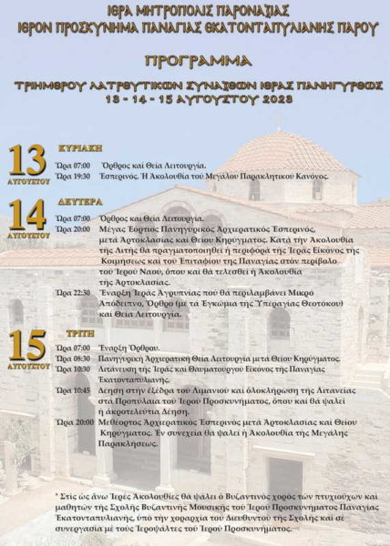 Την Τρίτη 15 Αυγούστου θα τελεστεί Πανηγυρική Αρχιερατική Θεία Λειτουργία μετά Θείου Κηρύγματος καθώς και η Λιτάνευση της Ιεράς και Θαυματουργού Εικόνας της Παναγίας Εκατονταπυλιανής
