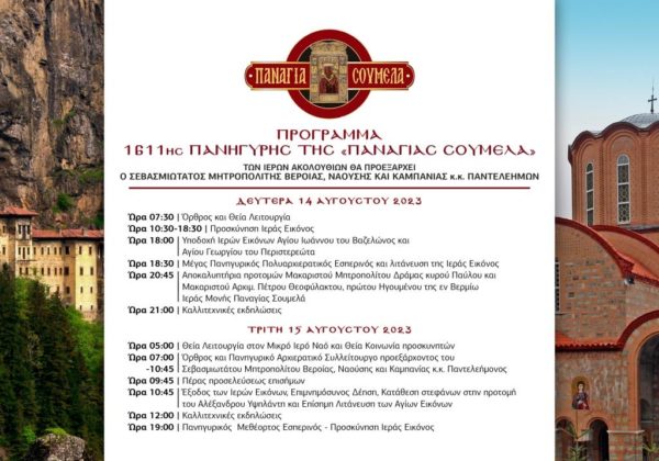 Ο Πανηγυρικός Εσπερινός θα ξεκινήσει σήμερα στις 18:30 ενώ στη συνέχεια θα ακολουθήσει η λιτάνευση της ιερά εικόνας. Θα ακολουθήσει η αποκάλυψη προτομών Μακαριστού Μητροπολίτη Δράμας κυρού Παύλου και Μακαριστού Αρχιμανδρίτη Πέτρου Θεοφυλάκτου, πρώτου Ηγουμένου της εν Βερμίω Ιεράς Μονής Παναγίας Σουμελά.