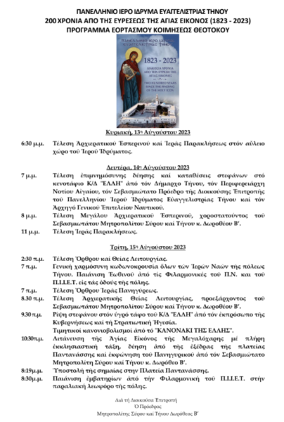Αναλυτικά, το πρόγραμμα του εορτασμού της εθνικοθρησκευτικής πανηγύρεως της 15ης Αυγούστου: