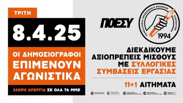 Τα Διοικητικά Συμβούλια της Πανελλήνιας Ομοσπονδίας Συντακτών (ΠΟΕΣΥ) και των δημοσιογραφικών Ενώσεων – μελών της (ΕΣΗΕΑ, ΕΣΗΕΜΘ, ΕΣΗΕΠΗΝ, ΕΣΗΕΘΣτΕΕ και ΕΣΠΗΤ), συναποφασίσαμε την πραγματοποίηση νέας εικοσιτετράωρης απεργίας για όλους τους δημοσιογράφους, σε όλα τα ΜΜΕ της χώρας, από τις 5 το πρωί της Τρίτης 8 Απριλίου μέχρι τις 5 το πρωί της Τετάρτης 9 Απριλίου. Η τρίτη κατά σειρά απεργία γίνεται μία ημέρα πριν από τη Γενική απεργία που έχουν προκηρύξει για τις 9 Απριλίου τα συνδικάτα του ιδιωτικού και δημόσιου τομέα της χώρας, με αιχμή την υπογραφή συλλογικών συμβάσεων εργασίας. Αίτημα που αποκτά πανελλαδικό χαρακτήρα.
