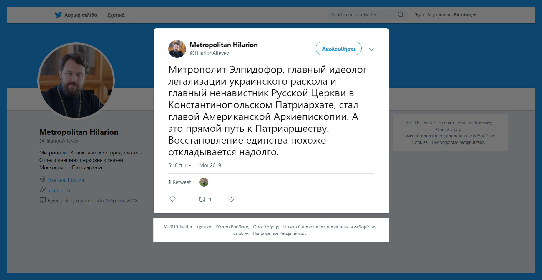 Προβληματισμένος από την εκλογή του νέου Αρχιεπισκόπου Αμερικής, κ. Ελπιδοφόρου, δηλώνει ο πρόεδρος του Τμήματος Εξωτερικών Εκκλησιαστικών Σχέσεων του Πατριαρχείου της Μόσχας, Μητροπολίτης Βολοκολάμσκ κ. Ιλαρίων.