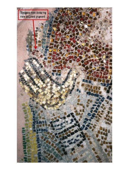 Οι χρυσές παλάμες του αγίου δεν ανήκουν στην αρχική μορφή του ψηφιδωτού. Πολλές ενδείξεις, μεταξύ των οποίων η διατήρηση τμήματος του δείκτη του δεξιού αντίχειρα, αποδεικνύουν ότι αρχικά οι παλάμες ήταν καμωμένες με μικρές ανοιχτόχρωμες, λίθινες και μαρμάρινες ψηφίδες, όπως δηλαδή το πρόσωπο του αγίου και των άλλων μορφών.