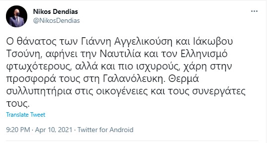 Υπουργός Εξωτερικών κ. Νίκος Δένδιας επίσης με ανάρτησή του στο twitter σημείωσε: «Ο θάνατος των Γιάννη Αγγελικούση και Ιάκωβου Τσούνη, αφήνει την Ναυτιλία και τον Ελληνισμό φτωχότερους, αλλά και πιο ισχυρούς, χάρη στην προσφορά τους στη Γαλανόλευκη. Θερμά συλλυπητήρια στις οικογένειες και τους συνεργάτες τους.»