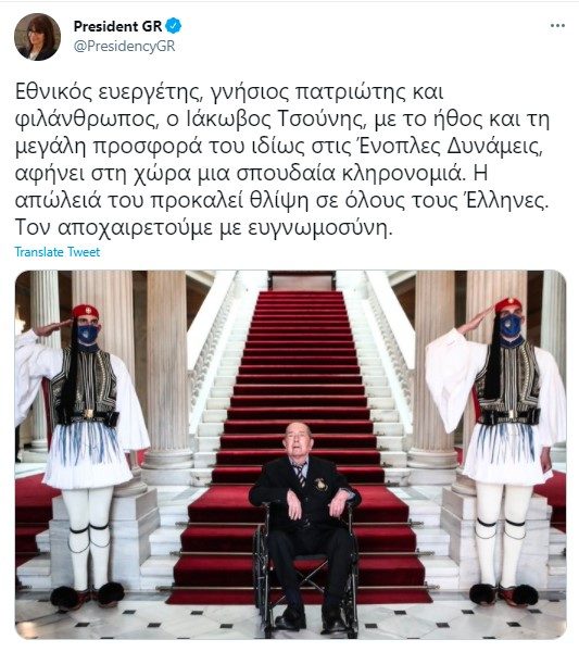 «Εθνικός ευεργέτης, γνήσιος πατριώτης και φιλάνθρωπος, ο Ιάκωβος Τσούνης, με το ήθος και τη μεγάλη προσφορά του ιδίως στις Ένοπλες Δυνάμεις, αφήνει στη χώρα μια σπουδαία κληρονομιά. Η απώλειά του προκαλεί θλίψη σε όλους τους Έλληνες. Τον αποχαιρετούμε με ευγνωμοσύνη» τονίζει η Πρόεδρος της Δημοκρατίας κα. Αικατερίνη Σακελλαροπούλου σε ανάρτησή της στα Μέσα Κοινωνικής Δικτύωσης.