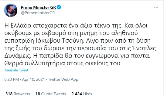 «Η Ελλάδα αποχαιρετά ένα άξιο τέκνο της. Και όλοι σκύβουμε με σεβασμό στη μνήμη του αληθινού ευπατρίδη Ιάκωβου Τσούνη. Λίγο πριν από τη δύση της ζωής του δώρισε την περιουσία του στις Ένοπλες Δυνάμεις. Η πατρίδα θα τον ευγνωμονεί για πάντα. Θερμά συλλυπητήρια στους οικείους του»