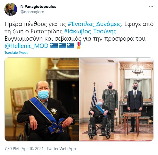 «Ημέρα πένθους για τις Ένοπλες Δυνάμεις. Έφυγε από τη ζωή ο Ευπατρίδης Ιάκωβος Τσούνης. Ευγνωμοσύνη και σεβασμός για την προσφορά του» αναφέρει στην ανάρτησή του ο υπουργός Εθνικής ‘Αμυνας.