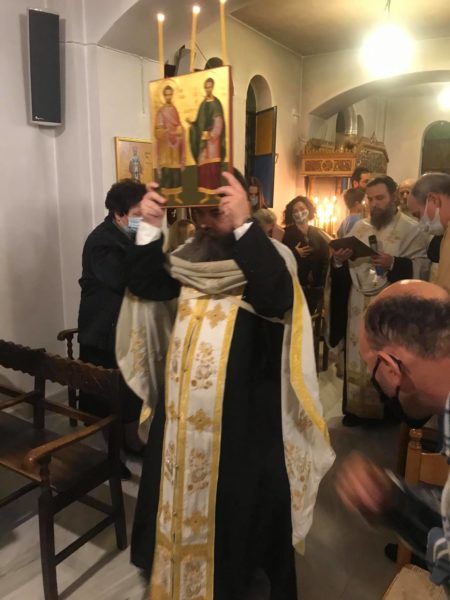 Οι ιερείς και το ευσεβές πλήρωμα ευχήθηκαν το “Χρόνια Πολλά! Και του χρόνου!” εορτάζοντας τους τιμωμένους Αγίου θαυματουργούς Αναργύρους Κοσμά και Δαμιανό.