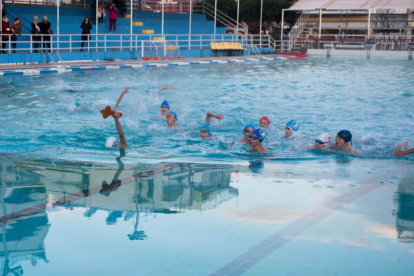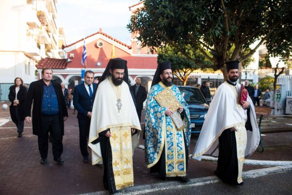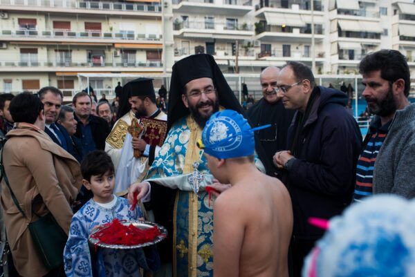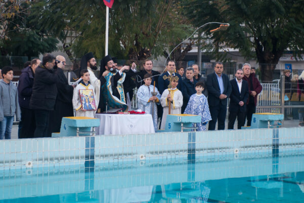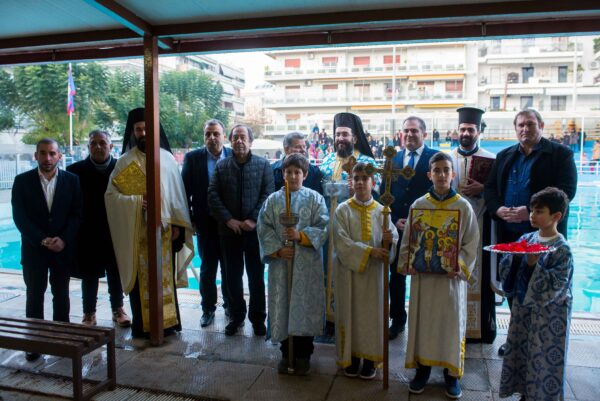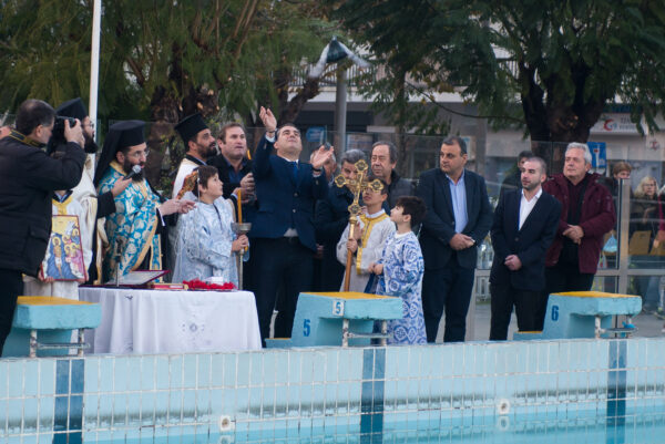 Στη συνέχεια, εν πομπή μετέβησαν στο Δημοτικό Κολυμβητήριο όπου τελέστηκε η καθιερωμένη τελετή, ενώ τον Τίμιο Σταυρό έπιασε ο μαθητής της ΣΤ’ τάξης Δημοτικού Δημοσθένης Λυκοτραφίτης.