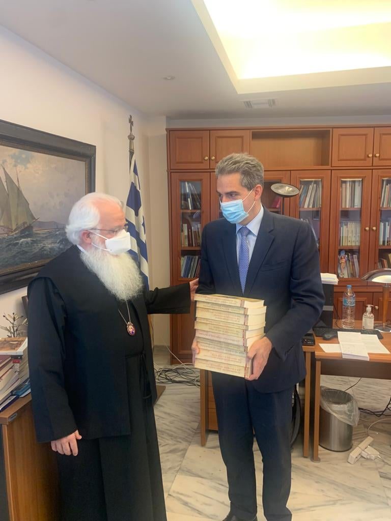 Ο Σεβασμιώτατος παρέδωσε στον κ. Συρίγο τα Πρακτικά των δέκα ετησίων Διεθνών Επιστημονικών Συνεδρίων που έχει υλοποιήσει η Ειδική Συνοδική Επιτροπή Πολιτιστικής Ταυτότητος της Εκκλησίας της Ελλάδος με αφορμή τα 200 χρόνια από την έναρξη της Ελληνικής Επανάστασης.