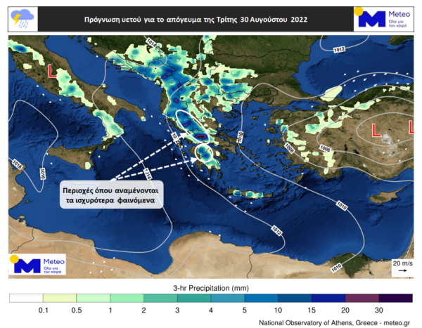 Σύμφωνα με τα τελευταία προγνωστικά δεδομένα του Εθνικού Αστεροσκοπείου Αθηνών / meteo.gr τοπικές βροχές και καταιγίδες αναμένονται από το μεσημέρι της Τρίτης 30 Αυγούστου κατά κύριο λόγο στα ορεινά ηπειρωτικά (πλην των ανατολικών τμημάτων της Θράκης), στα ορεινά της Κρήτης και ενδεχομένως στο Ιόνιο και σε νησιά του Ανατολικού Αιγαίου.