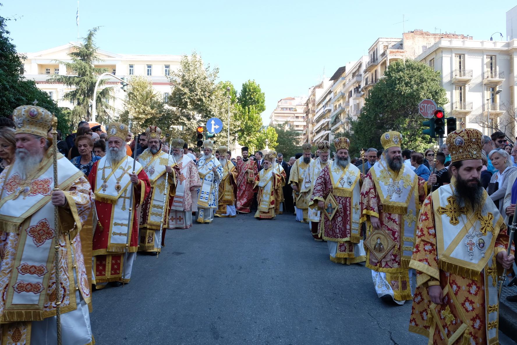 Της Ιεράς Λιτανεύσεως, προεξήρχε ο Παναγιώτατος Μητροπολίτης Θεσσαλονίκης κ.κ. Άνθιμος, πλαισιούμενος από τους Σεβασμιωτάτους Μητροπολίτες Βρυούλων κ. Παντελεήμων, Βεροίας, Ναούσης και Καμπανίας κ. Παντελεήμων, Αυλώνος κ. Χριστοδούλου, Σερρών και Νιγρίτης κ. Θεολόγου, Αρκαλοχωρίου, Καστελλίου και Βιάνου κ. Ανδρέα, Σιδηροκάστρου κ. Μακαρίου, Νεαπόλεως και Σταυρουπόλεως κ. Βαρνάβα, Ηλιουπόλεως κ. Θεοδώρου (Πατριαρχείο Αλεξανδρείας), Μεσσηνίας κ. Χρυσοστόμου, Λαγκαδά, Λητής και Ρεντίνης κ. Ιωάννου, Λύδδης κ. Δημητρίου (Πατριαρχείο Ιεροσολύμων), Γρεβενών κ. Δαβίδ, Τρίκκης και Σταγών κ. Χρυσοστόμου, Φιλίππων, Νεαπόλεως και Θάσου κ. Στεφάνου, Σισανίου και Σιατίστης κ. Αθανασίου, και των Θεοφιλεστάτων Επισκόπων Θερμών κ. Δημητρίου και Αμορίου κ. Νικηφόρου (Πατριαρχείο Κωνσταντινουπόλεως).