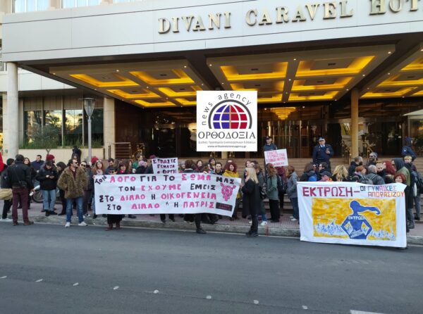 Έξω απο το ξενοδοχείο ΚΑΡΑΒΕΛ ευρίσκονταν, νωρίς το απόγευμα, γυναίκες με πανό, αναγράφοντας “προκλητικά” συνθήματα υπέρ των εκτρώσεων.