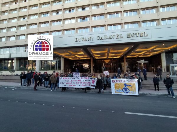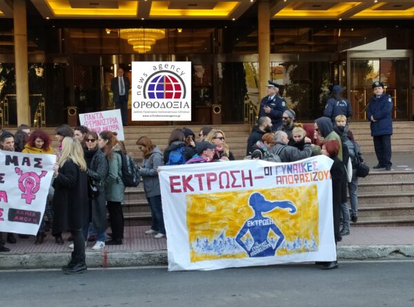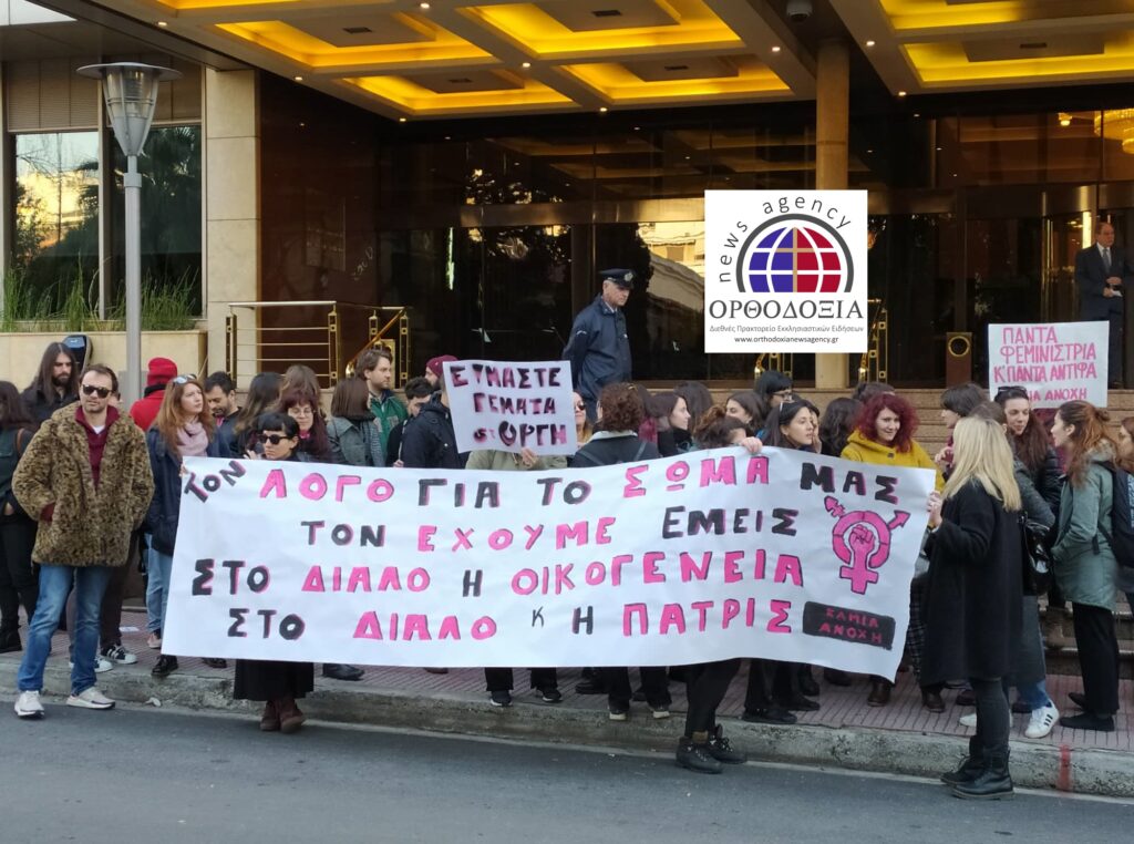 Έξω απο το ξενοδοχείο ΚΑΡΑΒΕΛ ευρίσκονταν, νωρίς το απόγευμα, γυναίκες με πανό, αναγράφοντας “προκλητικά” συνθήματα υπέρ των εκτρώσεων.