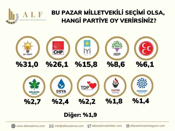 Όπως προκύπτει από τη δημοσκόπηση, το κόμμα του Ρετζέπ Ταγίπ Ερντογάν (AKP) συγκεντρώνει το 31%.