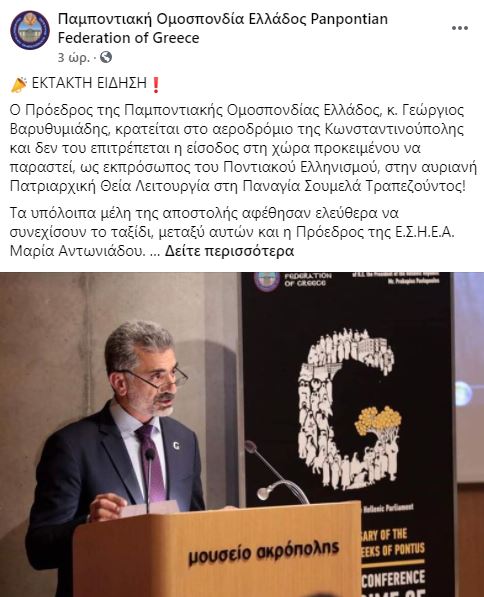 Ο Πρόεδρος της Παμποντιακής Ομοσπονδίας Ελλάδος, κ. Γεώργιος Βαρυθυμιάδης, κρατήθηκε την Παρασκευή στο αεροδρόμιο της Κωνσταντινούπολης και δεν του επιτράπηκε η είσοδος στη χώρα προκειμένου να παραστεί, ως εκπρόσωπος του Ποντιακού Ελληνισμού, στην Πατριαρχική Θεία Λειτουργία στη Παναγία Σουμελά Τραπεζούντος.