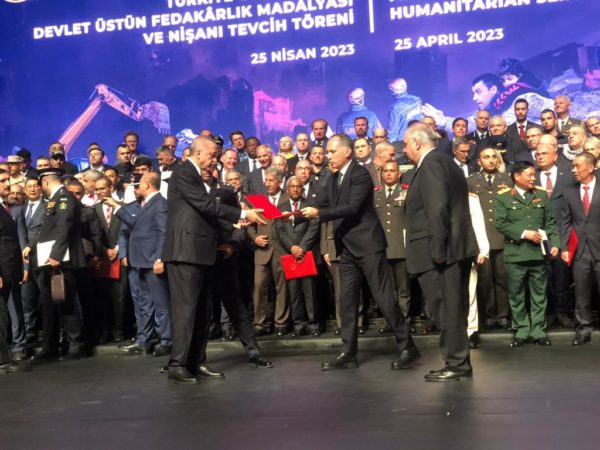“Σήμερα απονέμουμε μετάλλια σε εγχώριες και ξένες ομάδες έρευνας και διάσωσης που έκαναν θυσίες κατά τη διάρκεια των σεισμών της 6ης Φεβρουαρίου”, είπε ο Ερντογάν στην τελετή απονομής του προεδρικού μεταλλίου για εξαιρετικές ανθρωπιστικές υπηρεσίες.