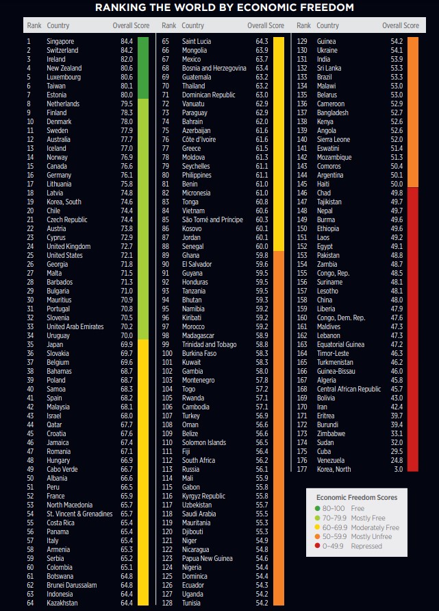 Η χώρα έλαβε συνολική βαθμολογία 56,9 στα 100 και κατηγοριοποιήθηκε ως «ως επί το πλείστον μη ελεύθερη» σύμφωνα με τους δείκτες μέτρησης που περιλαμβάνουν τη ρυθμιστική αποτελεσματικότητα, το κράτος δικαίου και τις ανοιχτές αγορές.