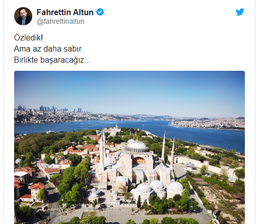 Στο λογαριασμό του στο Twitter, o Φαχρετίν Αλτούν, ανάρτησε μια φωτογραφία της Αγίας Σοφίας – που έχει μετατραπεί από μουσουλμανικό τέμενος σε μουσείο το 1935 – και την ακόλουθη φράση: «Μας έλλειψε! Αλλά κάντε υπομονή. Θα τα καταφέρουμε μαζί».
