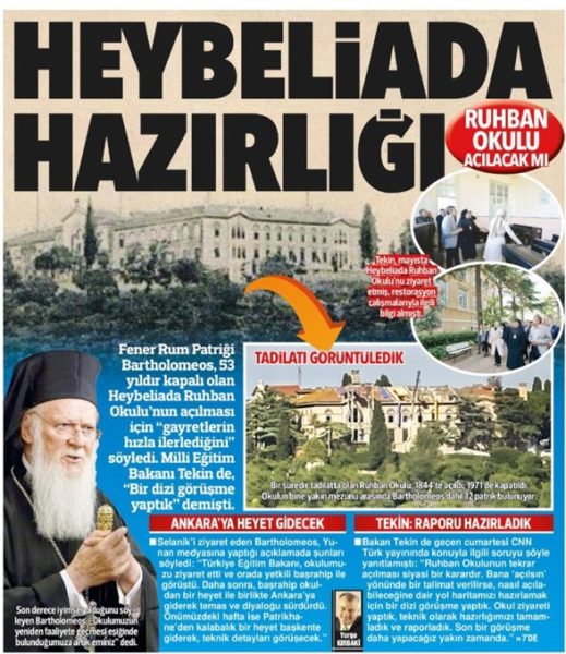 Στο δημοσίευμα σημειώνεται ότι «οι εργασίες αποκατάστασης στη Σχολή συνεχίζονται εδώ και αρκετό καιρό. Ο Ρωμιός Πατριάρχης Βαρθολομαίος (σ.σ. όπως χαρακτηρίζεται ο Οικουμενικός Πατριάρχης από την εφημερίδα) δήλωσε επίσης στον ελληνικό Τύπο ότι ο Πρόεδρος Ερντογάν έδωσε οδηγίες στο Υπουργείο και δήλωσε: “Είμαστε πλέον βέβαιοι ότι βρισκόμαστε στα πρόθυρα της επαναλειτουργίας”».