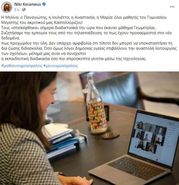 “Η Μελίνα, ο Παναγιώτης, η Ιουλιέττα, η Αναστασία, η Μαρία: όλοι μαθητές του Γυμνασίου Μεγίστης του ακριτικού μας Καστελλόριζου!” αναφέρει η Υπουργός Παιδείας και Θρησκευμάτων κα Νίκη Κεραμέως σε επίκαιρη ανάρτησή της. “Τους «επισκέφθηκα» σήμερα διαδικτυακά την ώρα που έκαναν μάθημα Γεωμετρίας. Συζητήσαμε την εμπειρία τους από την τηλεκπαίδευση, το πως έχουν προσαρμοστεί στα νέα δεδομένα, πως προχωράνε την ύλη. Δεν υπάρχει αμφιβολία ότι τίποτε δεν μπορεί να υποκαταστήσει τη δια ζώσης διδασκαλία. Όσο όμως λόγοι δημόσιας υγείας επιβάλλουν την αναστολή λειτουργίας των σχολείων, μέλημά μας είναι να συνεχιστεί η εκπαιδευτική διαδικασία όσο πιο απρόσκοπτα γίνεται μέσω της τεχνολογίας”.