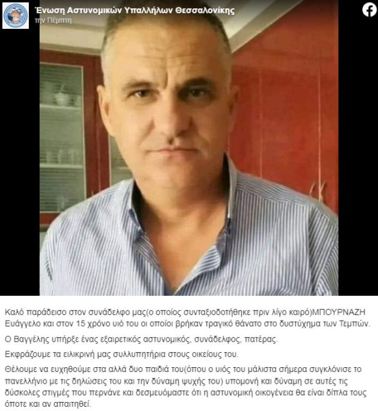 “Καλό παράδεισο στον συνάδελφό μας (ο οποίος συνταξιοδοτήθηκε πριν λίγο καιρό) ΜΠΟΥΡΝΑΖΗ Ευάγγελο και στον 15 χρόνο υιό του, οι οποίοι βρήκαν τραγικό θάνατο στο δυστύχημα των Τεμπών. Ο Βαγγέλης υπήρξε ένας εξαιρετικός αστυνομικός, συνάδελφος, πατέρας. Εκφράζουμε τα ειλικρινή μας συλλυπητήρια στους οικείους του.