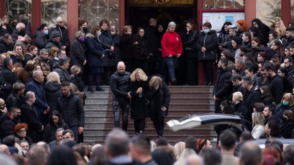 Πλήθος κόσμου συγκεντρώθηκε στον ναό του Αγίου Δημητρίου στη Λάρισα για να πουν το τελευταίο αντίο στην 21χρονη Κλαούντια-Αλεξάνδρα, θύμα του πολύνεκρου σιδηροδρομικού δυστυχήματος στα Τέμπη.