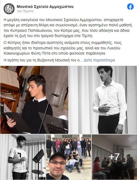 Με μηνύματα συγκίνησης τον αποχαιρέτησαν τα σχολεία του, το Μουσικό Σχολείο Αμμοχώστου και το Λύκειο Κοκκινοχωρών Φώτη Πίττα στα οποία φοίτησε.