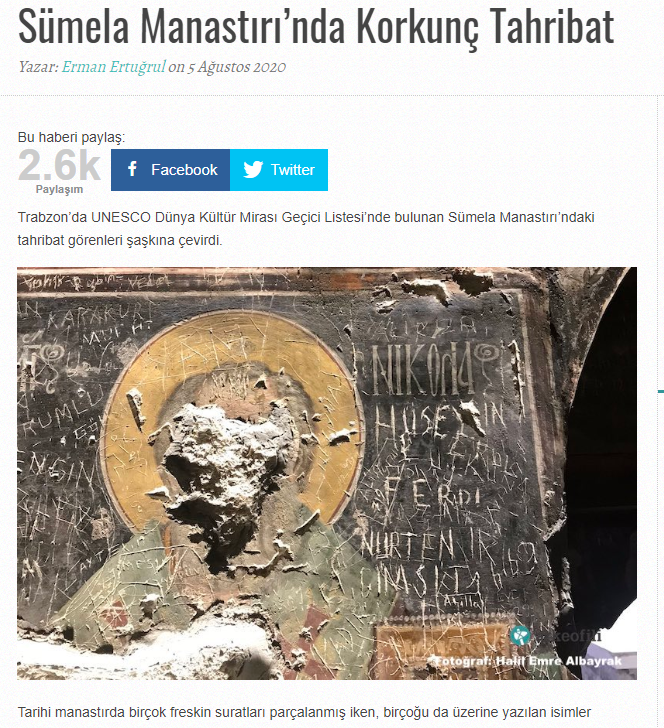 Λίγες ημέρες ημέρες μετά το άνοιγμα της Παναγίας Σουμελά στην Τραπεζούντα, η οποία παρέμεινε κλειστή επί 5 χρόνια για εργασίες αποκατάστασης, ο ιστότοπος arkeofili.com δημοσιεύει θλιβερές εικόνες.